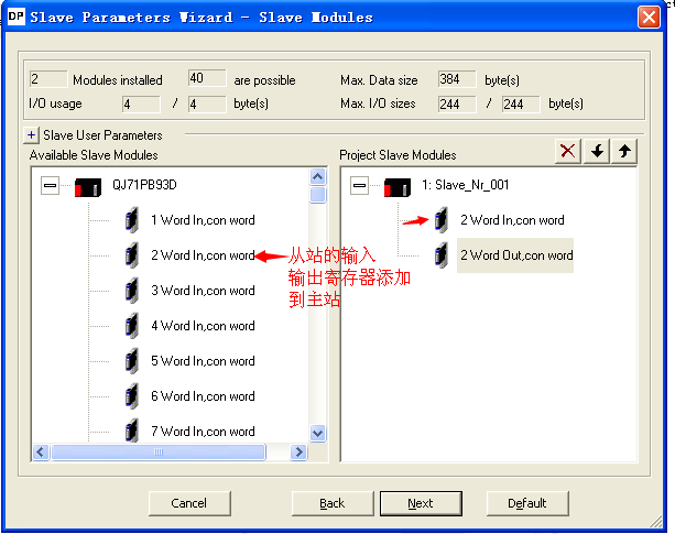 1、新建→2、選擇型號QJ71PB93D→3、下一步,如圖j,插槽位置、填寫從站站號,(如圖k)填寫從站輸入輸出寄存器數(shù)。