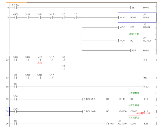 主站QJ71PB92V的程序:把主站要傳送給從站的數(shù)據(jù)寫進(jìn)D2000-D2017,讀取從站的數(shù)據(jù)在D0。