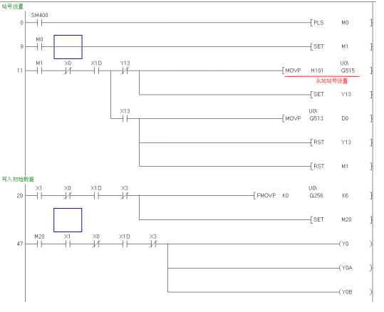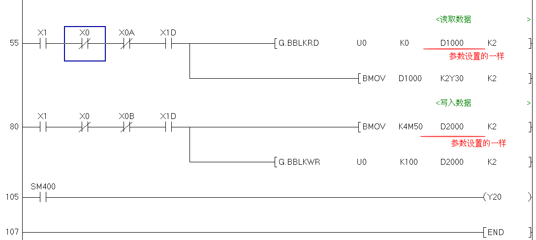 從站QJ71PB93D的程序:把寫給主站的數(shù)據(jù)寫進(jìn)D2000-D2001,讀取主站的數(shù)據(jù)在D1000-D1001,