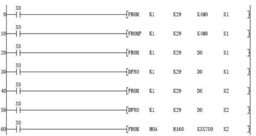 40行:當X0=1時,讀取1號(第1個K1)模塊緩沖區地址29(K29)和30中的數據保存到寄存器D0和D1中。