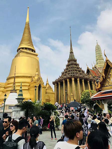 第一站:首先是到泰國(guó)必游的大皇宮與玉佛寺,游大皇宮和寺有許多的禮儀規(guī)矩,如:在入大皇宮時(shí),不能穿拖鞋,上衣不能穿無(wú)袖下身著裝必須蓋過(guò)膝蓋,入寺廟需脫鞋等等,不過(guò)在此之前海藍(lán)的小伙伴早就做好相關(guān)的功課,當(dāng)然是順利進(jìn)行游玩,小編提醒:還沒(méi)去過(guò)泰國(guó)旅游的小伙伴在去泰國(guó)一定要做好相關(guān)功課,了解當(dāng)?shù)亓?xí)俗文化,不然會(huì)被擋在門外喲!
