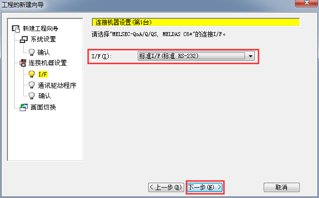 2.1.5 設置I/F端連接設置,(標準I/F 標準 RS232)默認,后單擊[下一步]