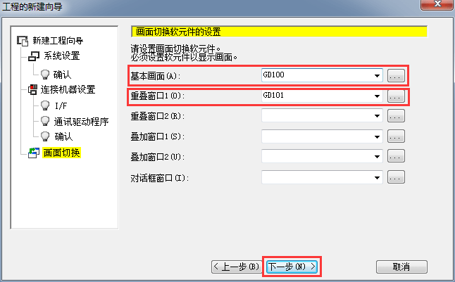 2.1.8 畫面切換軟元件設置,設置基本畫面和重疊窗口軟元件地址,后單擊[下一步]