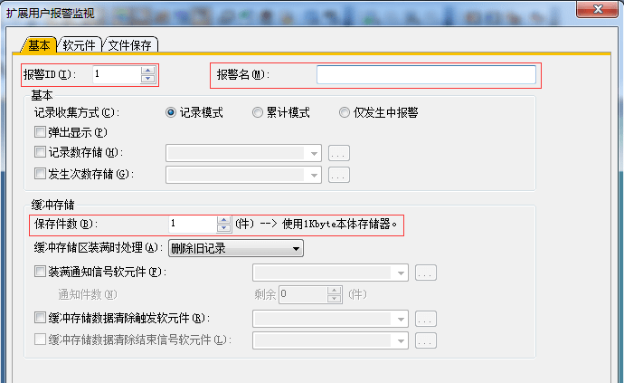 2.3.3 擴展用戶報警監視-基本設置,設置報警ID及名稱,一般默認1,報警名可自定義,保存件數(設置與報警點數相同)可增加,用于報警存放報警點數。